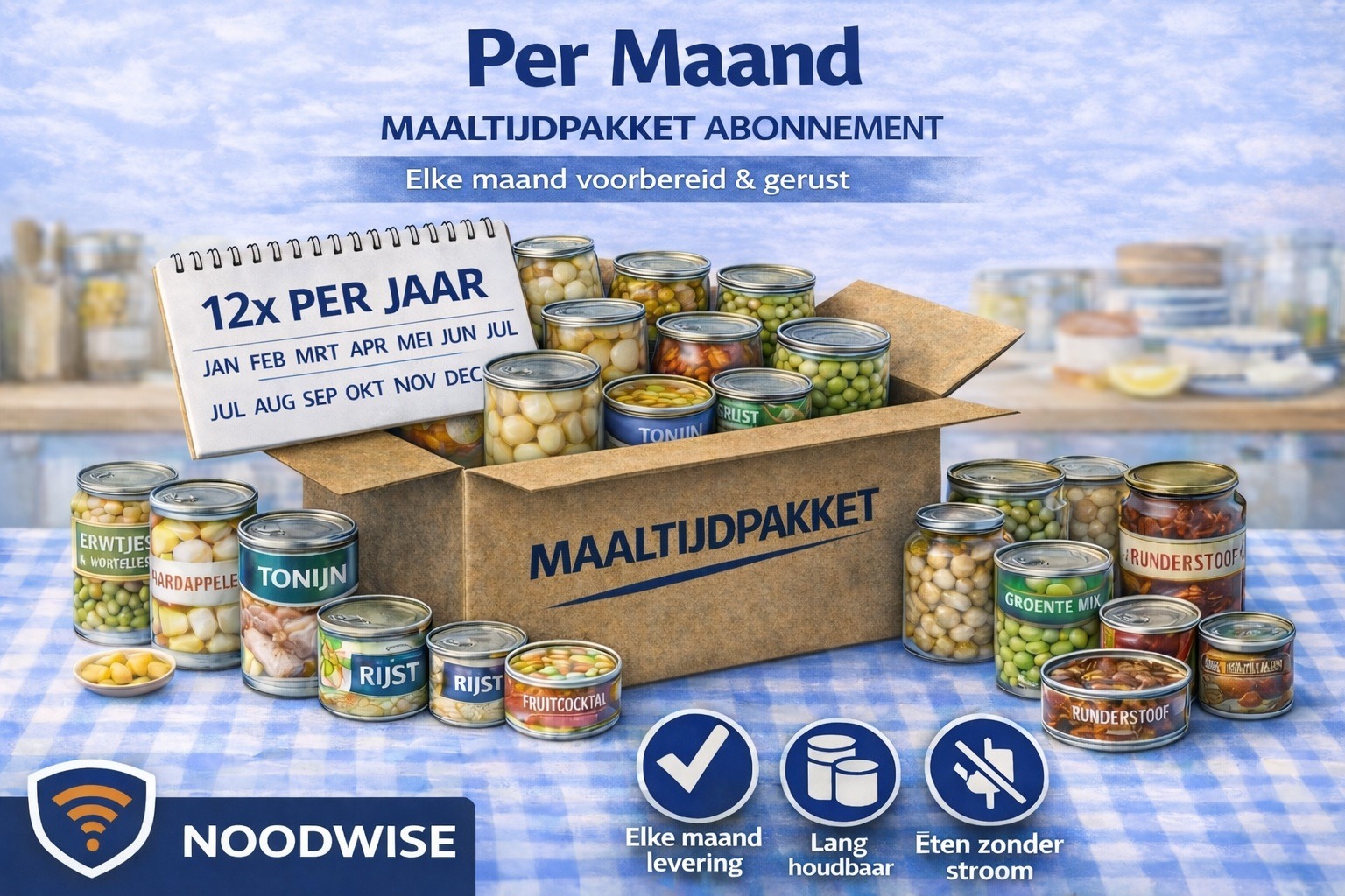 Met het NoodWise Maaltijdpakket Abonnement – Jaarlijks ontvang je één keer per jaar automatisch een compleet maaltijdpakket bij je thuis. Dit abonnement is ideaal voor wie rustig en overzichtelijk voorbereid wil zijn, zonder frequente leveringen of extra handelingen.